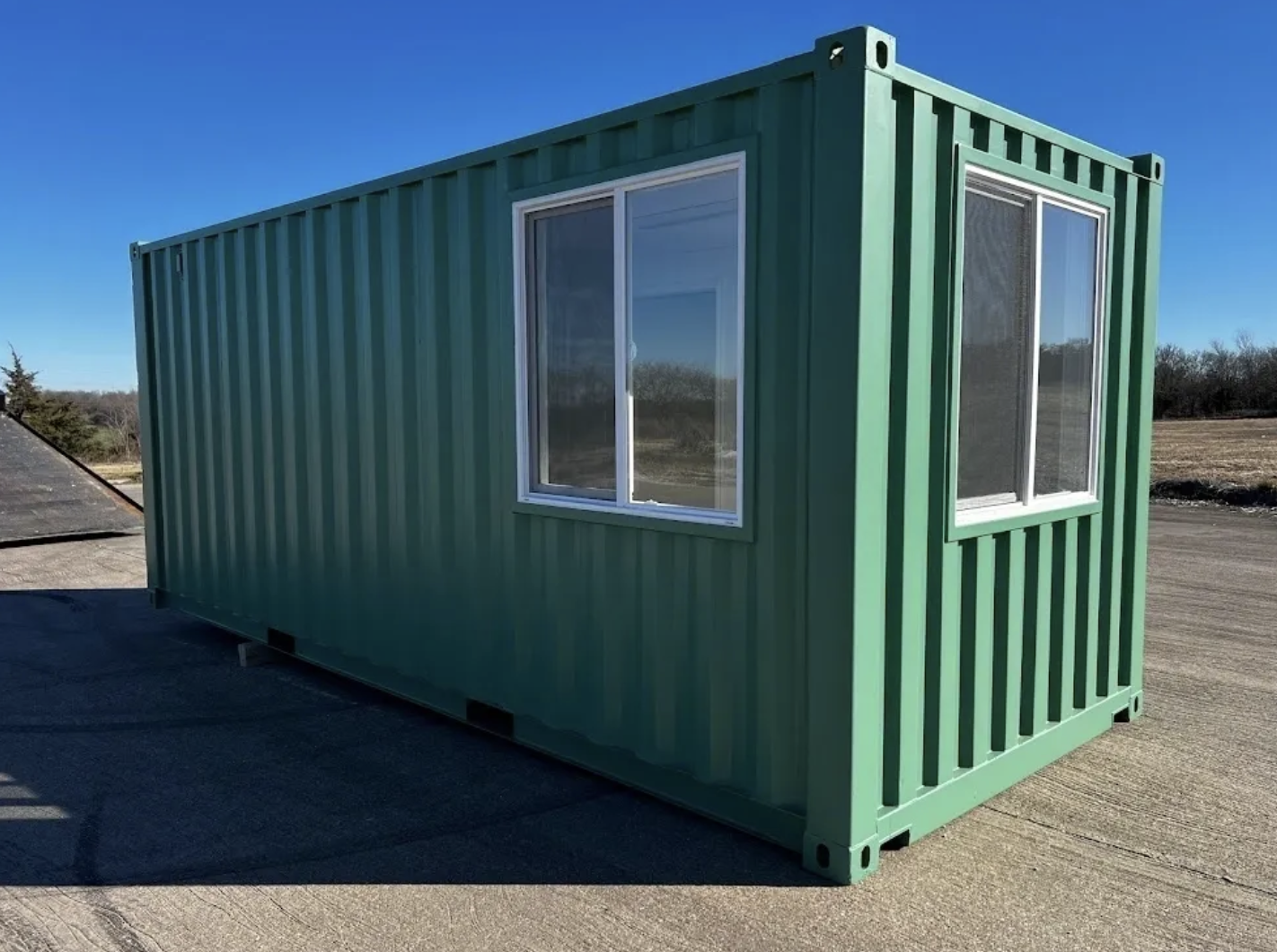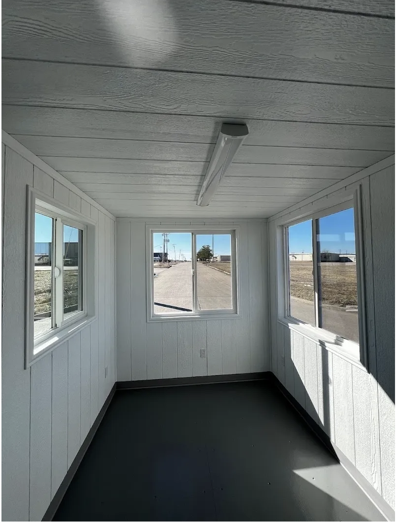 Our New 1-Trip Modified Shipping Container Offices/Cabins can be equipped or upfiitted with many different features and options. Our entry level mobile offices/cabins are completely framed out and fully insulated R13 Faced Bat Insulation. We offer three different wall & celing covering options and Dura Grip floors that provide our customers with years of low maintenance durabilty. Even our entry level units come upfitted with a 100 AMP Main Breaker and 12 additional spaces with up to seven electrical sockets for your growing electrical requirements. The 12000 BTU A/C with heat option will keep cool in the summer and provide a comfortable work enviroment during those chilly winter months. The two 36 x 36 windows with slide option allow for plenty of natural light and fresh air. The double bore commercial grade steel door with a locking lever and dead bolt will to deter most common thieves. Call us today at 972-333-1215 to find out what other options and features arvailable.